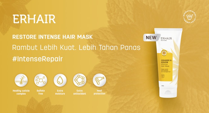 ERHAIR Restore Intense Hair Mask mengandung Heat Protection yang mampu melindungi rambut Anda dari panasnya hair styling tools. Bahkan, produk ini juga menjadi produk pertama di Indonesia yang diklaim mampu melindungi rambut dari suhu panas hingga 220 derajat celsius.
