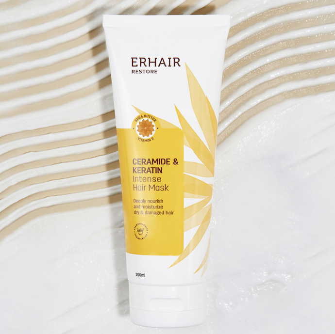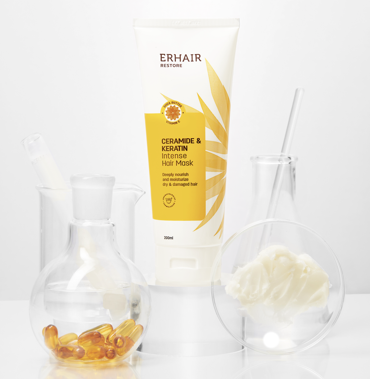 ERHAIR Restore Intense Mask diperkaya dengan Healthy Cuticle Complex, yaitu kombinasi ceramide dan Hydrolized Keratin. Ceramide berfungsi untuk melindungi lapisan kutikula agar rambut tetap kuat dan terhidrasi. Di sisi lain, Hydrolized Keratin merupakan partikel micro keratin yang terserap hingga lapisan terdalam rambut. Partikel inilah yang berguna untuk mengembalikan protein yang hilang pada batang rambut.